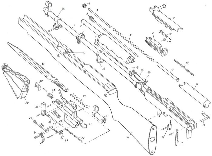 Под № 2 на схеме карабина СКС значится съёмная газоотводная трубка в сборе с накладкой цевья. Совершенно непонятен восторг Сергея Бадюка от наличия аналогичной детали в автомате Калашникова