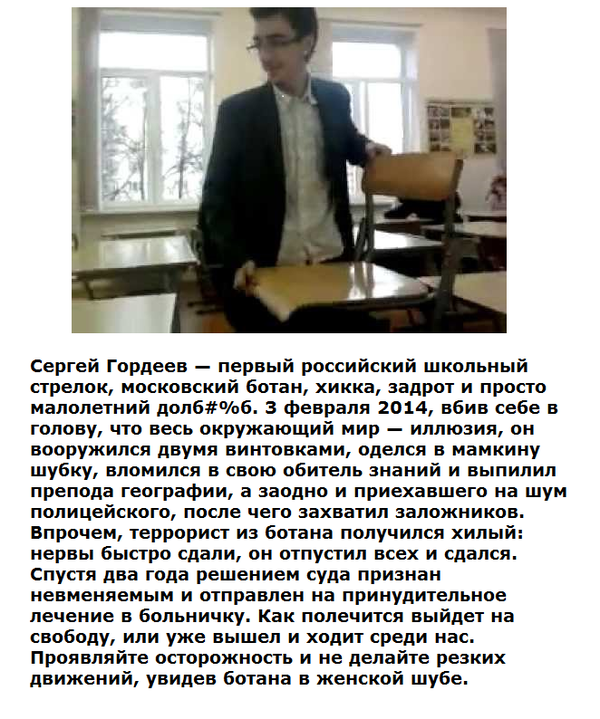 Стук в дверь. Андрей Николаевич встает с места и идет к двери, открывает ее. Сначала показывается лицо десятиклассника, странно, на первых уроках его не было...через мгновение оно исчезает, слышен громкий хлопок. Девичий крик. Учитель падает прямо у выхода. Сергей заходит в класс, в руках у него оружие, в глазах - сумасшествие. Он проходит за кафедру, держа весь класс на прицеле. Оцепенение.