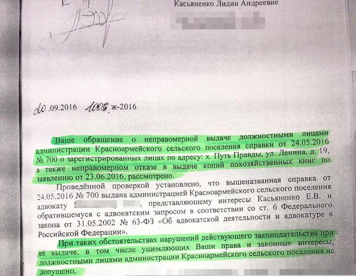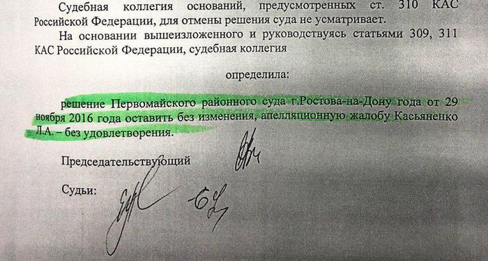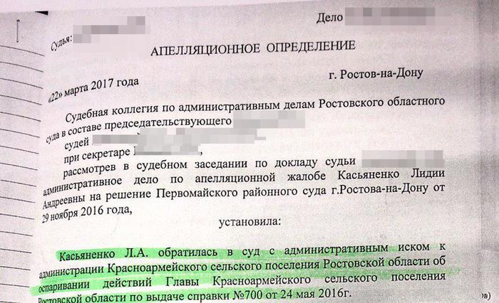 Однако в конце ноября 2016 года суд отказал Лидии Андреевне в иске по причине ничтожности ее доводов, признав справку главы поселения законной, допустимой и соответствующей действительности. Это решение оставлено в силе и после апелляционной жалобы Л. А. Касьяненко в Ростовском областном суде. Кроме того, прокуратура Ростовской области, также по жалобам Лидии, ТРИЖДЫ проверяла законность выдачи этой справки и соответствие сведений, указанных в ней на основании похозяйственной книги, и тоже признала действия главы поселения законными.