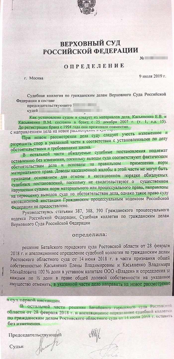 Но нет, Жорин и здесь нагло заявляет, что, оказывается, Елена заставила своего мужа так написать. Заставила, представляете? На основании этого адвокаты Дениса подали апелляционные жалобы в Октябрьский суд, вдумайтесь, от имени покойного Касьяненко Владимира Михайловича! Якобы он сейчас просит отменить решение 2008 года об удочерении Анны — спустя более чем 10 лет после вынесения решения и спустя 4 года после смерти самого заявителя! Вам не кажется, что это уже слишком? Заигрались, ребята, в собственной лжи. Что же касается решения, а точнее, определения ВС РФ от 09.07.2019, который, со слов Жорина, все отменил к чертовой бабушке, Верховный суд РФ четко на третьем листе своего определения прописал, что и составом Верховного суда, и судами всех низших инстанций был безапелляционно установлен факт совместного проживания Касьяненко В. М. с Касьяненко Еленой и Анной с 1994 года! На основании этого ВС РФ оставил в силе решение Батайского городского суда как законное и обоснованное (все объекты недвижимости, земельные участки остались в собственности Елены), отменив его только в части юридического лица ООО «Владен», указав на необходимость предоставления сторонами дополнительных доказательств в суде первой инстанции. И опять же о незаконности выдачи каких-либо справок и т. д. там нет ни слова.