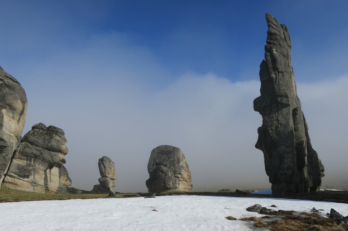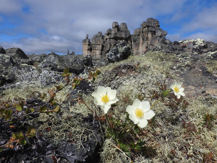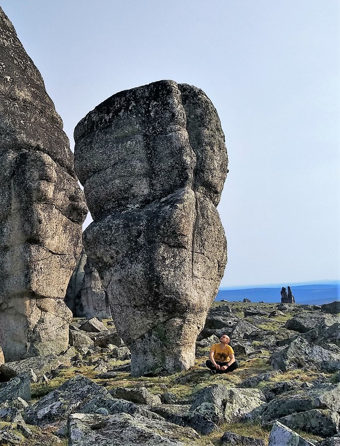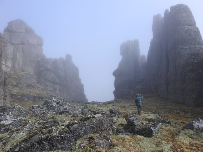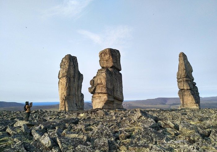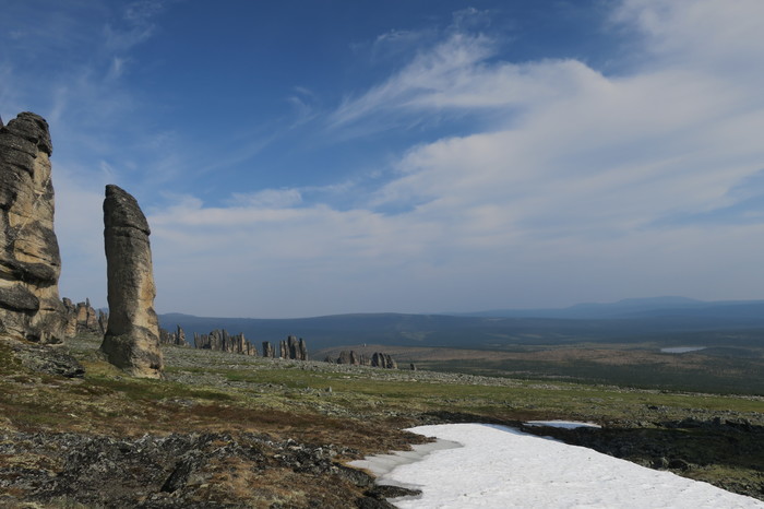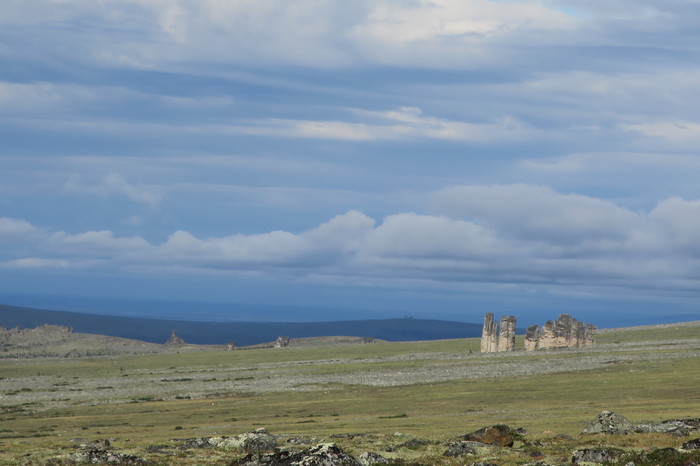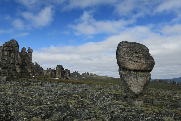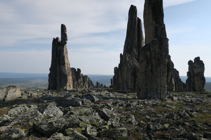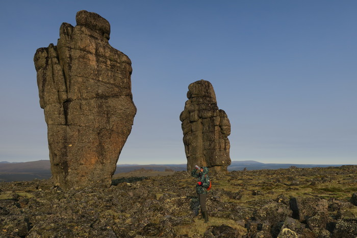 От Похвального начинается пешая часть маршрута – 30 км: сначала по вездеходному следу, потом через лес, местами заболоченный, потом по холмам, покрытым тундровой растительностью. Дошли за 2 дня и встали лагерем. Всего заброска от Москвы до лагеря заняла 5 дней. Стояли 8 дней, совершая радиальные выходы и осматривая скальные комплексы-города, которых там около 10.