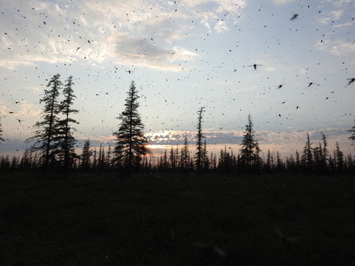 Край крайне суровый - "ночью", несмотря на июль-месяц, были и отрицательные температуры, замерзали лужи, днем было до +32 градусов, временами дул ураганный ветер, который порвал нам тент, и чуть не унес нас вместе с палатками прямо в страну Оз. Вместо летучих обезьян были бесчисленные полчища комаров, мошкИ и слепней, которые обгладывали любой открытый участок кожи, прокусывая штаны, майки, носки, шапки. Столько комаров я никогда не видел. Пробираясь через заболоченный лес, я много размышлял, почему нет лесных "китов", которые бы питались всей этой огромной биомассой лесного летающего "планктона". Особое впечатление произвело незаходящее круглосуточно за горизонт солнце – полярный день.