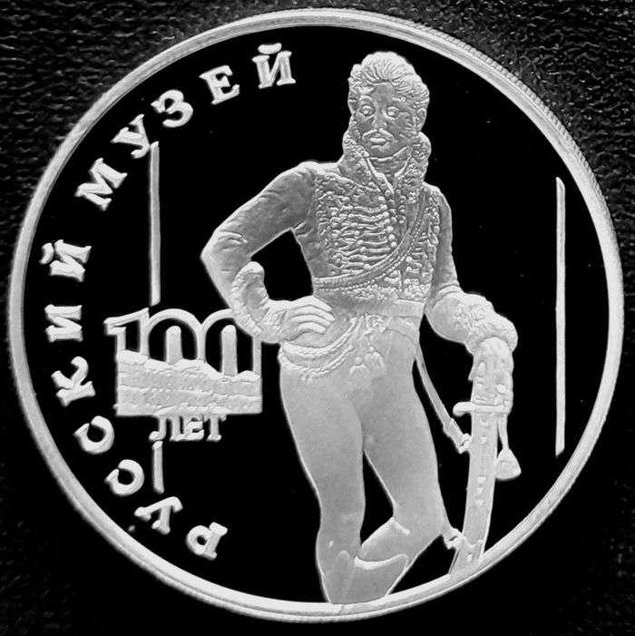 Эта монета выпущена в 1998 году к 100-летию Русского музея. На монете портрет Давыдова Е.В. кисти Кипренского О.А.
