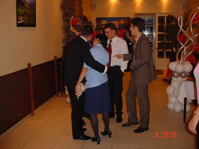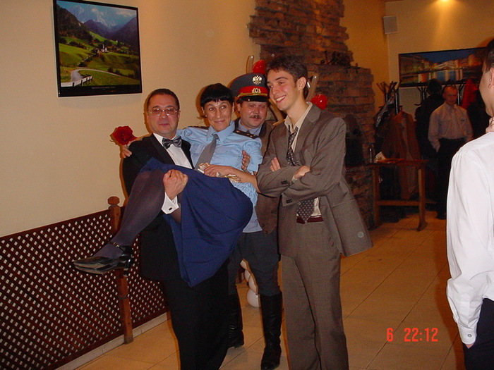 В самый разгар торжества, когда все гости уже основательно подопьют, раздается стук в дверь прямо, как в пятой симфонии Бетховена и входят мрачные люди в военной и милицейской ( тогда была ещё милиция) форме. Противными казенными голосами они говорят: Мы из военкомата, разыскиваем призывников таких-то, были по домашнему адресу, соседи сообщили, что вы находитесь здесь на мероприятии и мы должны вручить им повестки в армию, у меня друг работал в военкомате и заполненные повестки обещал сделать. Здесь на сцену выхожу я во фраке( ну пусть в смокинге)) и возмущенно начинаю протестовать против вторжения в личую жизнь граждан, но представители власти непреклонны и я вынужден сознаться, что сыновья находятся здесь. Сыновья, как студенты, имели отсрочку от армии, но были у нас определенные нюансы в этом вопросе, останавливаться подробно на которых, я не буду, так что должно было сработать. Они выходят пред ясны очи силовиков и те вручают им повестки. Далее следует мхатовская пауза, во время которой эмоции публики накаляются до температуры плавления вольфрамовой дуги. И вдруг здесь из всех динамиков гремит модная тогда песня " Паровоз умчится прямо на границу", официант из-за кулис выносит представителям закона поднос с запотевшими рюмками водки с бутиками и солеными огурчиками. Они лихо хлопают по рюмашке, потом мы дружно поем хором эту замечательную песню, тоже хлопаем по рюмахе. Все обнимаются и плачут слезами счастья. Катарсис. Занавес.