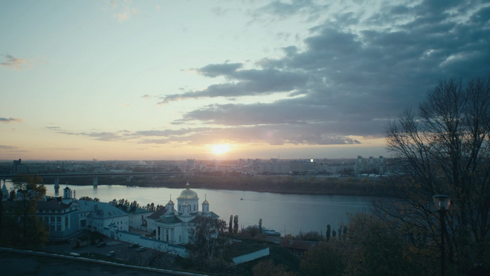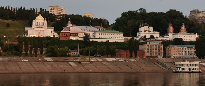 Река - это явно Ока, вдали опять тот самый метромост, под развилкой которого живет Меглин, а вот церковь здесь - это Благовещенский мужской монастырь. Вид на него хорош не только сверху, но и с реки. У меня как раз нашлось фото с реки, где виден весь комплекс монастыря: