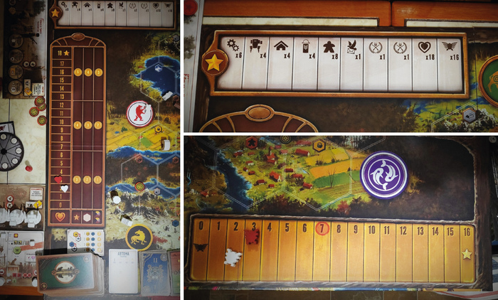 Серп - это смесь механик, здесь есть и оптимизация действий и строительство своего планшета, чтобы получать бонусы и ресурсы и сражения (хотя они и не являются самоцелью). Играется все это чудо довольно бодро, ходы идут по кругу, каждый игрок выполняет 1-2 действия, как следствие низкий даунтайм и общая вовлечённость в процесс.
