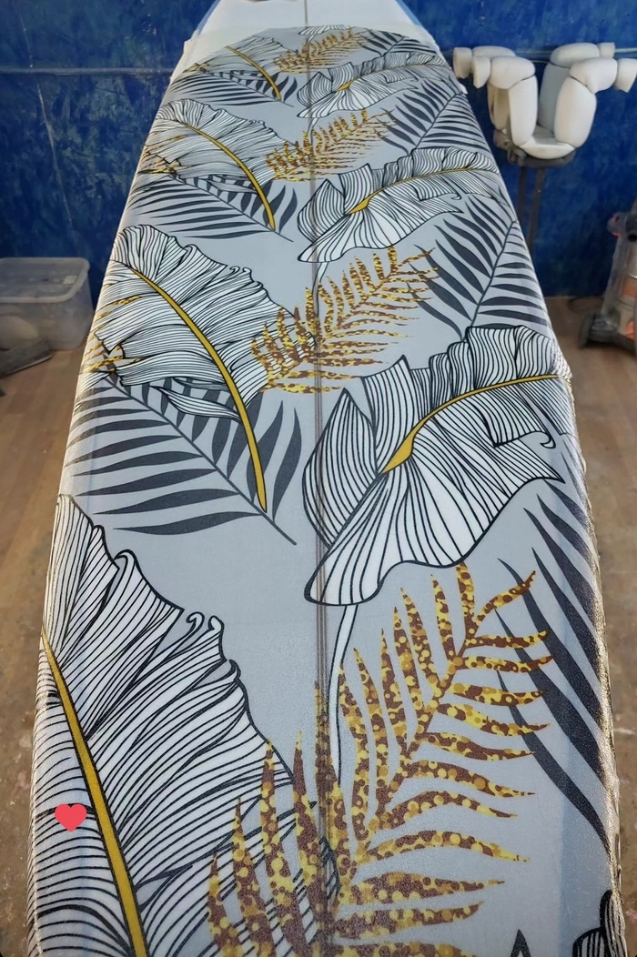 Сегодня занимался кастомизацией доски для серфинга, закрывал часть палубы тканью с принтом и заливал смолой. Красиво получается!