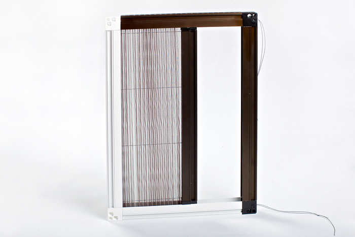 Модель состоит из алюминиевого каркаса, нитей натяжения и плиссированной сетки. Нити гарантируют устойчивое положение створки, участвуют в её открывании/закрывании. По мере надобности, полотно легко убрать в самый край проёма и полностью освободить его.