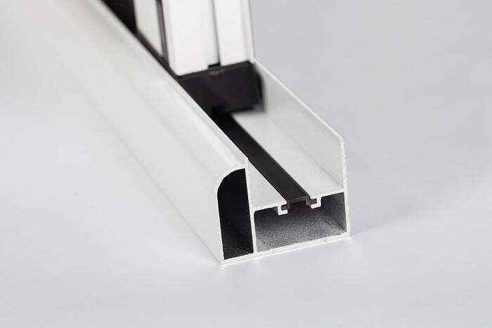 Выполняется из алюминиевых направляющих. Чем толще стенки профиля, тем более устойчивой будет готовая система. Тонкостенный вариант тоже держит сетку, но при управлении полотном ощущается небольшая подвижность каркаса.