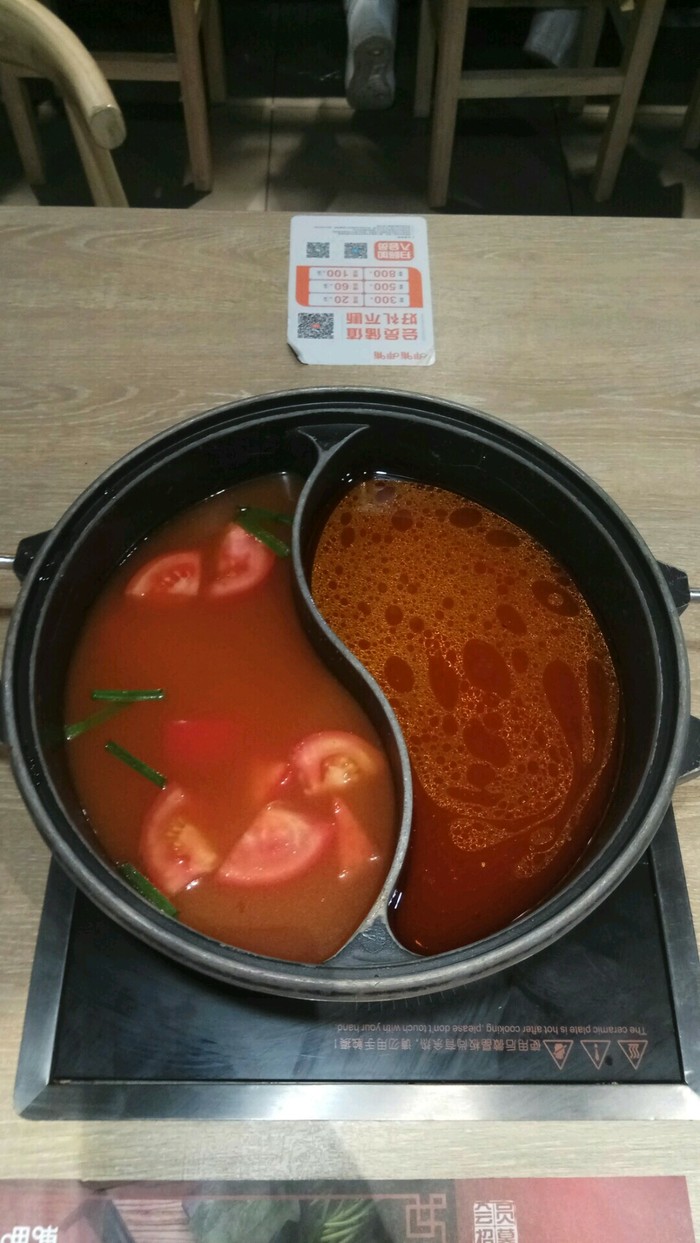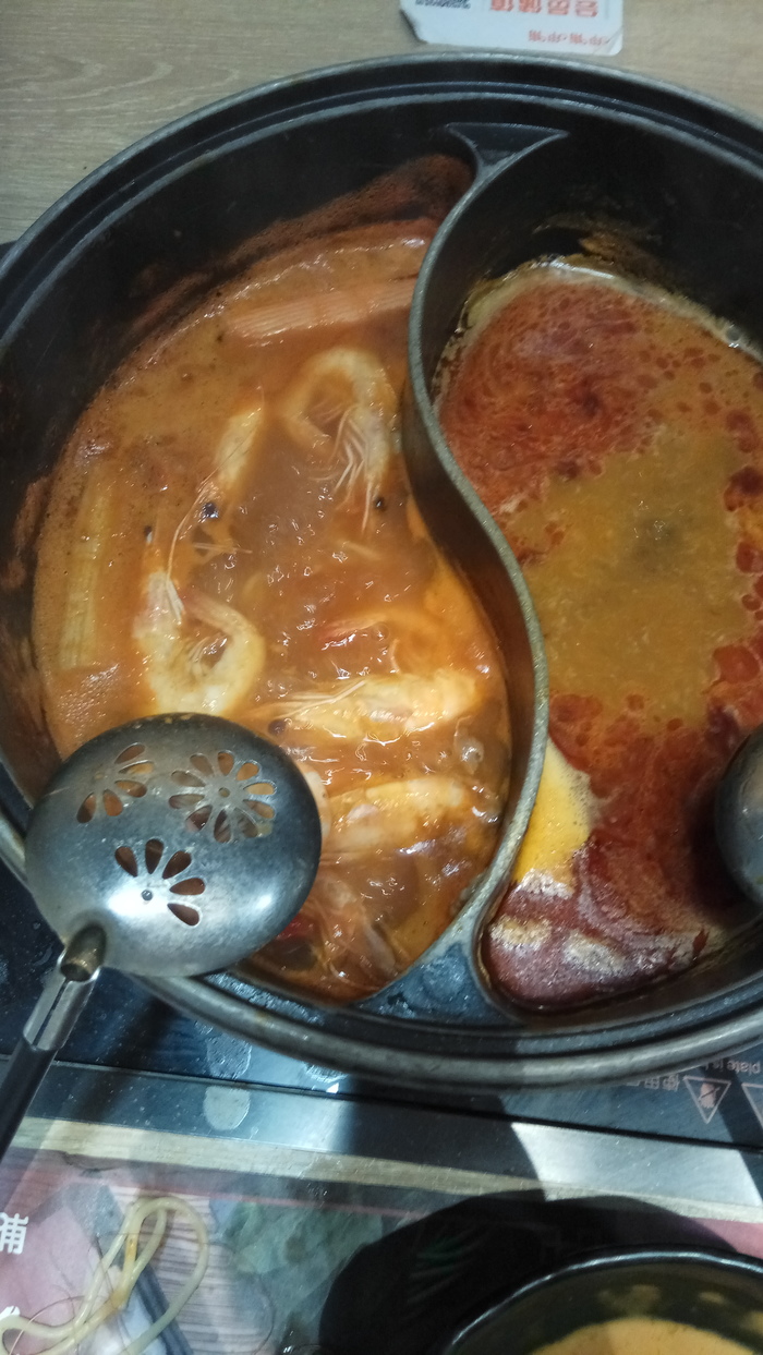 Принесли два бульона (томатный и острый) и поставили на плиту на моем столе. Бульон начал нагреваться.