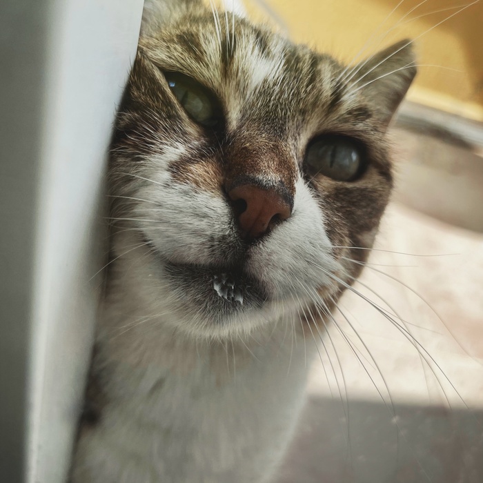 Однажды шел сильный дождь, и вымокший малыш взобрался по дереву, чтобы укрыться у нас. Я вынесла ему молока и похлопала рукой по стулу, показывая, что в дождь он может спать здесь, он снова все понял и с тех пор стал приходить еще до того, как дождь его изрядно подмочит. У нас было еще много необычных эпизодов с ним, например, когда мне было физически плохо, я прижалась лбом к холодному стеклу, а он с другой стороны терся своей мордочкой и мурчал, стало легче. Я всегда уважаю его личное пространство и не лезу с поглажками, за что он, кажется, благодарен даже больше, чем за молоко.