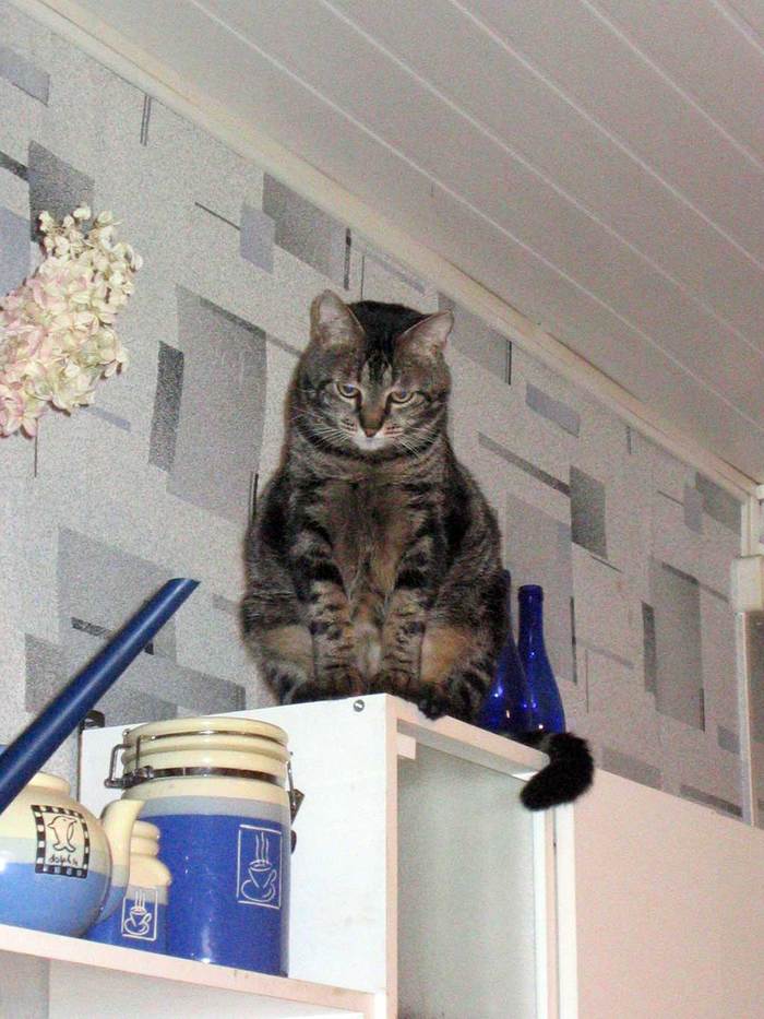 Банкетка явно не в духе. Хмуро покосившись на меня, кот прыгает на перила, раздраженно дернув хвостом, пристраивается поудобнее и замирает. Широко открытые желтые глаза-плошки смотрят в сад.