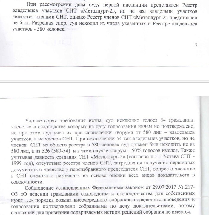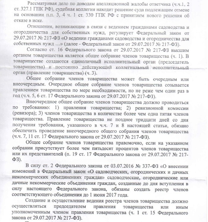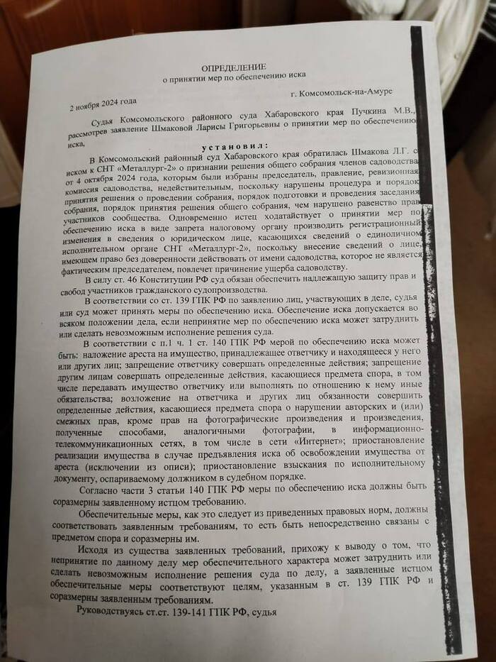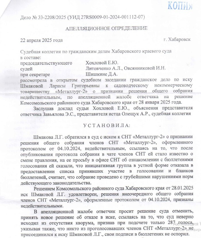 Казалось бы, выбрали того, кого хотим и выгнали старого председателя в лице С.И., но нет... Воспользовавшись своими связями, С.И. обратилась к местному НЕ! члену СНТ - подполковнику юстиции некой Шмаковой Л.В. оборонявшей её фронт по старой дружбе, либо за гонорар неопределенной величины с членских взносов дачников (остается только догадываться) с целью опротестования и аннулирования проведенных выборов нового председателя с предоставлением вот такого Определения (ниже по тексту)