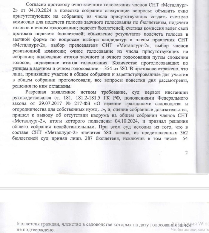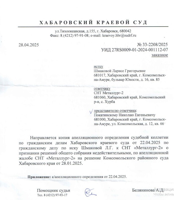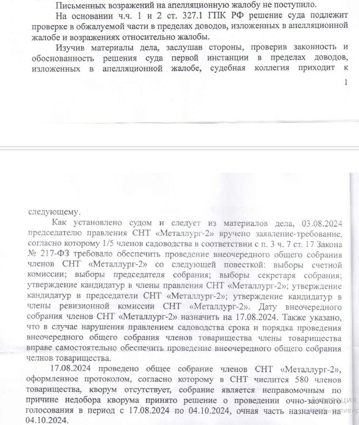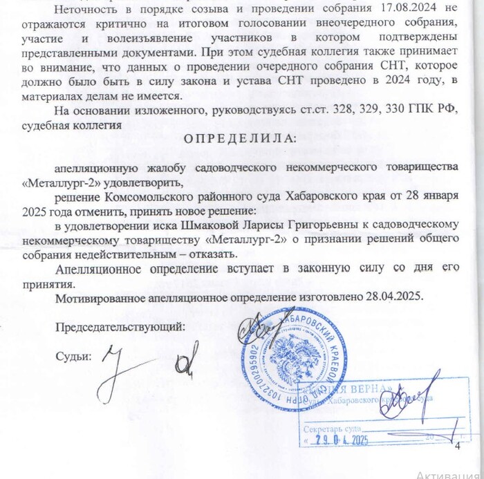 Спустя 5 месяцев наконец удалось получить Решение краевого суда, которое вступило в силу 22.04.2025г. Выбранным Председателем является Покатинский Николай Евгеньевич. Будет производится передача дел СНТ, о чём предупреждена бывший председатель. На данный момент Правление закрыто. Как только Николай Евгеньевич пройдёт окончательную регистрацию, будет открыт расчётный счёт СНТ.