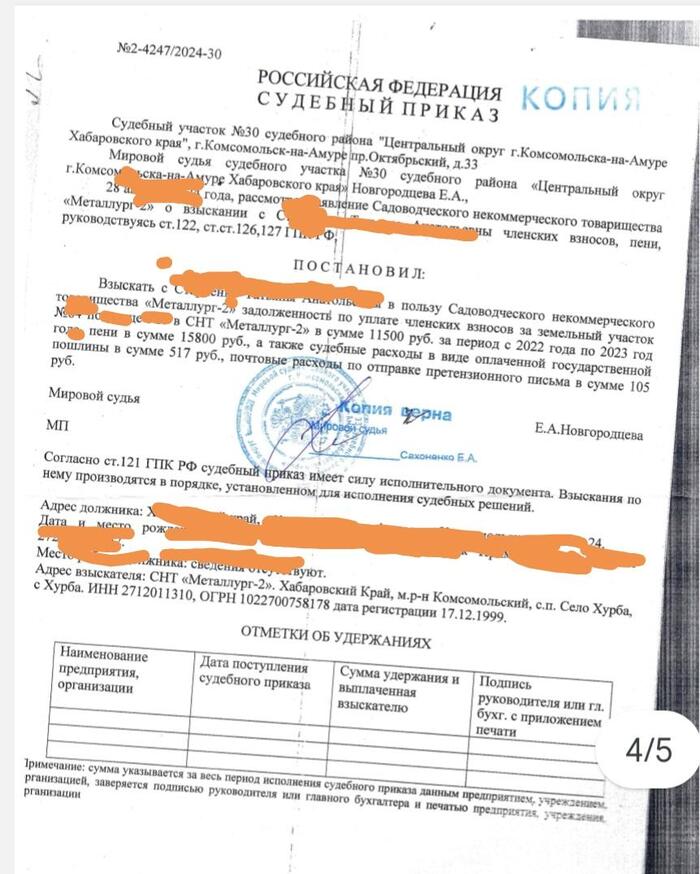 На данного человека нет управы в Комсомольском районе Хабаровском крае, она прикрывается связями и безнаказанностью, пренебрежением закона, соблюдением его норм и правил и просто издевается (в моральном смысле) над людьми над их правами и свободами. Общим собранием членов СНТ Металлург-2 осенью 2024 года мы ее переизбрали. Однако, бывший председатель СНТ Металлург-2 Ермольева С.И., покидать свой пост отказывается, ведет себя как хозяйка всей территории СНТ-Металлург-2. Документы новому председателю не передает. После того как ее переизбрали Ермольева С.И. стала еще наглее и озлобление. На территорию садоводства больше на личном автотранспорте не проедешь, пока у нее не купишь какой-то пропуск за 300(триста) рублей. То есть это какой-то непонятный, ничем необоснованный денежный сбор. Кто ей не платит, выходит из машины и идет пешком до своего земельного участка, при этом многие люди пожилые(пенсионеры). Она установила шлагбаум на въезде в садоводство, без соответствующего решения общего собрания членов СНТ Металлург-2. Обязала все оплатить «космическую» денежную сумму за установку данного шлагбаума. Цена данного шлагбаума в разы выше цен на данный товар в г. Комсомольске-на-Амуре. И вообще, как же право людей на свободное передвижение по территориям общего пользования. Также, Ермольева С.И. заключила никому не понятный договор, с ее слов с частным охранным предприятием «Рассвет». Мы попытались найти информации о данном ЧОПе и выяснили, что действительно, такое юридическое лицо существует, но со среднесписочной численностью сотрудников(охранников) 0(ноль) человек. Данные охранники находятся на въезде в СНТ Металлург-2 без соответствующей формы, удостоверений частного охранника и так далее. При этом в течение нескольких последних лет(не менее последних пяти-трех лет) Ермольева С.И. собирала со всех членов СНТ-Металлург-2 деньги за охрану при чем немалые. В штате СНТ Металлург-2 своих охранников нет. То есть получается, что эти деньги (собранные с членов СНТ Металлург-2) либо переводились по договору с ЧОО «Рассвет» на расчетные счета данного юридического лица, либо просто уходили на личные нужды Ермольевой С.И. Если уходили на расчетные счета ЧОО «Рассвет», то из чего тогда складывалась стоимость охраны, где лицензированные и экипированные охранники на въезде на территорию СНТ, где исполнение обязательств по договору, где оплаченные государству налоги с данных денежных средств, или это просто неосновательное обогащение ЧОО «Рассвет» за счет денежных средств членов СНТ Металлург-2, без фактического исполнения договорных обязательств. Если никаких договорных отношений нет, то тогда все просто - денежные средства, собранные с членов СНТ Металлург-2 уходили лично Ермольевой С.И.