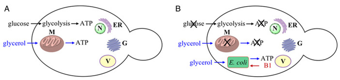 Рис. 2. Дизайн эксперимента. А — нормальный обмен веществ в клетке дрожжей: глюкоза расщепляется в ходе гликолиза с образованием АТФ. Другие органические вещества, в частности, глицерин, расщепляются в ходе цикла Кребса в митохондриях с образованием АТФ. В — химерная клетка. В питательной среде нет глюкозы, есть только глицерин, но собственные митохондрии дрожжевой клетки не работают. Добыть энергию из глицерина может только клетка E. coli, которая, в свою очередь, получает от «хозяина» витамин B1. Изображение из обсуждаемой статьи в PNAS