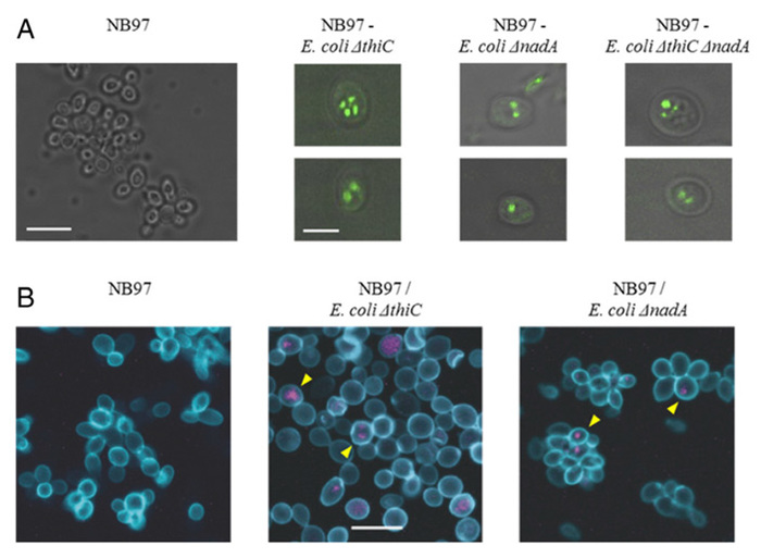 Рис. 4. Колонии химерных клеток, образованные разными штаммами кишечной палочки. Слева направо: контроль (клетки дрожжей), химера с E. coli, дефицитными по тиамину, химера с E. coli, дефицитными по НАД+, химера с E. coli, дефицитными по обоим коферментам. А — зеленым светится GFP в клетках кишечной палочки. В — дрожжи окрашены голубым (краситель FITC), бактерии — фиолетовым зондом, связывающимся с бактериальной РНК. Желтые стрелки указывают на примеры химерных клеток. Изображение из обсуждаемой статьи в PNAS