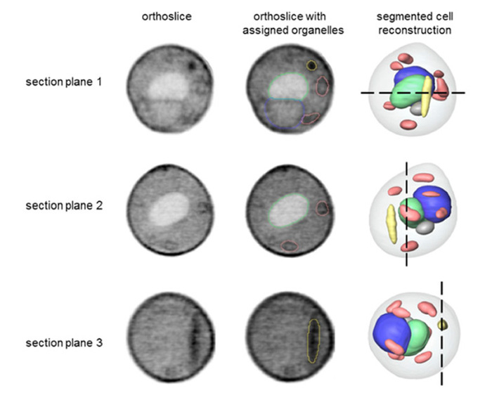 Рис. 3. Ультраструктура химерных клеток: результаты томографии под действием мягкого рентгеновского излучения. Сверху вниз — три плана в разных плоскостях. Левый столбец — просто снимок, средний столбец — снимок с выделенными органеллами, правый столбец — реконструкция клетки с обозначением плоскости среза (пунктирная линия). Изображение из обсуждаемой статьи в PNAS