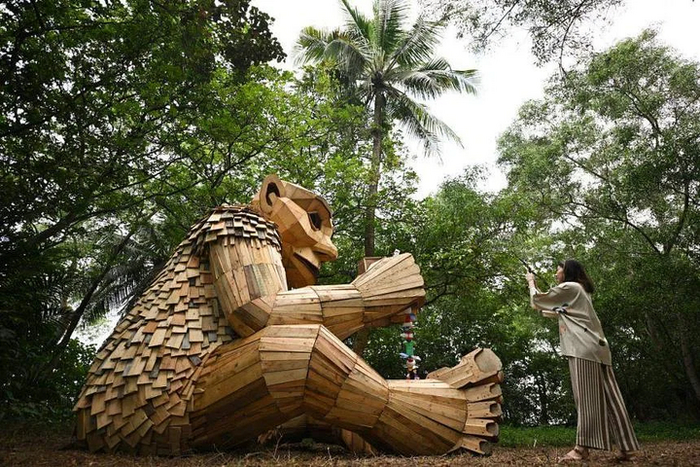 Волонтеры одну за другой несут двухметровые платформы на спине к кромке воды. Десять платформ связаны между собой веревкой из банановой кожуры.