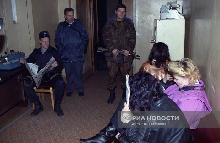 Нарушительницы комендантского часа, задержанные у гостиницы «Москва». Октябрь, 1993 год.