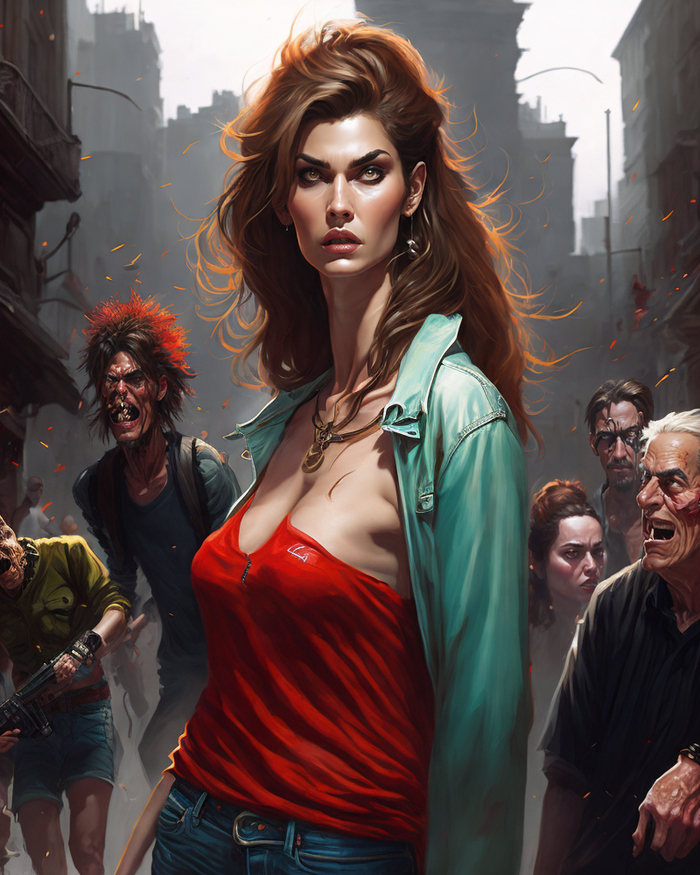 cindy crawford in the zombie apocalypse, hordes of zombies have crawled onto city streets, people are fleeing in terror, the main character confronts horrible zombies, there is chaos and a crazy world, day z, resident evil, 7 days to die zombie, fine art, award winning, intricate, elegant, sharp focus, cinematic lighting, highly detailed, digital painting, 8 k concept art, art by guweiz and z. w. gu, masterpiece, trending on artstation, 8 k ಠ, 2 k girls