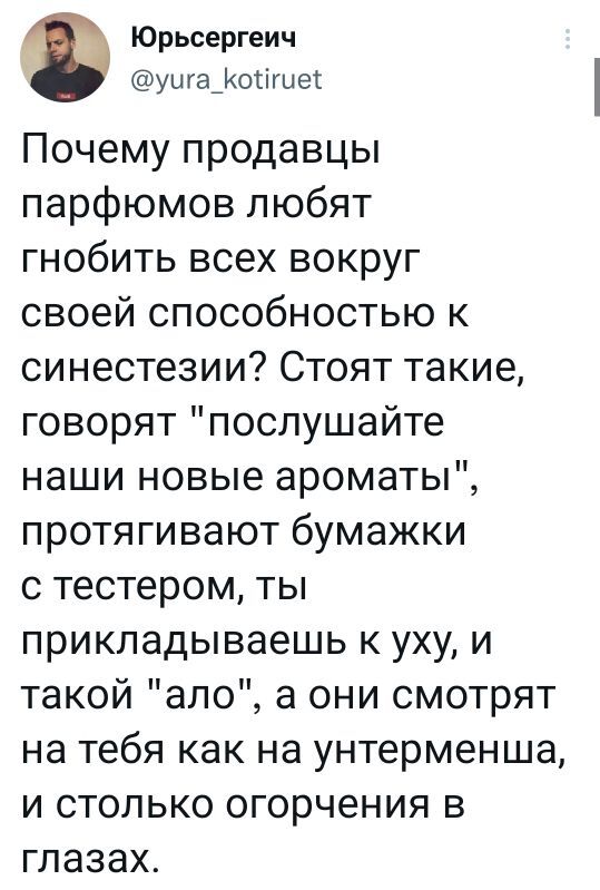 Когда я слышу слово «менеджер», чувствую вкус автомобильной резины, и это неприятно. И нет, я никогда не пробовала резину на вкус. Большинство вкусов ассоциируются с запахами, и это как запах шиномонтажки.