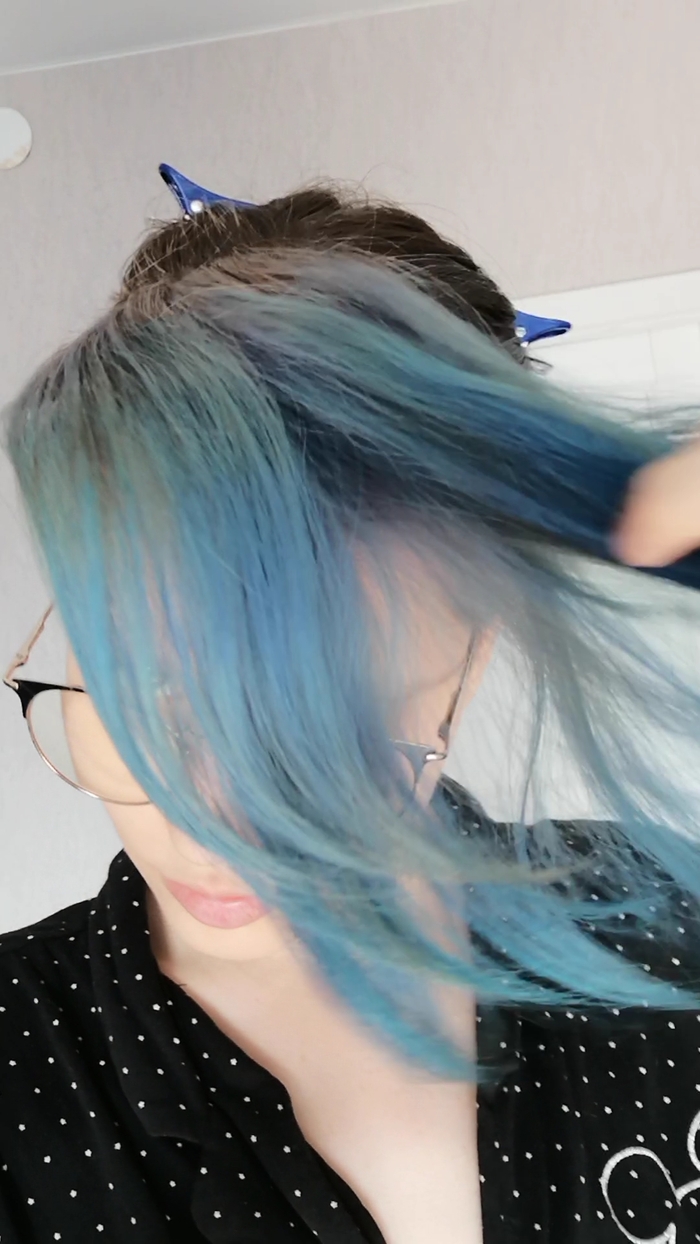 Сами волосы подвымылись и стали зелено-серо-голубыми. Вылила все оттенки в чашу и добавила кондиционер, чтобы лучше смешать красители, плюс они довольно густые. Вымыла как следует волосы и принялась красить. Покраска заняла у меня минут 40, держала это все 30 минут (эти 30 минут скоротала за оттиранием раковины, ибо все усрала).