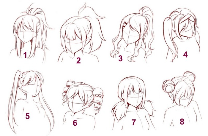 Ноги, крылья? Главное, хвост! Причёска-хвост на затылке нередко символизирует персонажа с отличным самоконтролем и силой воли. Такие персонажи энергичны, активны, нередко занимаются спортом, а ещё, как ни странно, часто бывают пацанками. Хвосты по бокам головы (4 и 5 на картинке внизу) символизируют персонажей умных, остроумных/игривых и непокорных, но не таких инфантильных, как девицы с короткими хвостиками. А весьма популярные в мире аниме завитки-буравчики (6) говорят о скверности нрава. Эти буравчики пробуравят весь мозг встреченному этой девушке главгерою, и нередко они же сочетаются ещё и с инфантильностью. Персонажи с пушистыми хвостиками (7) встречаются довольно редко, и практически всегда это дикие девчули, которым пофиг на правила, главное поразвлечься. Традиционные дульки (8) используются для обозначения не только дикого нрава, но и приверженности традициям.