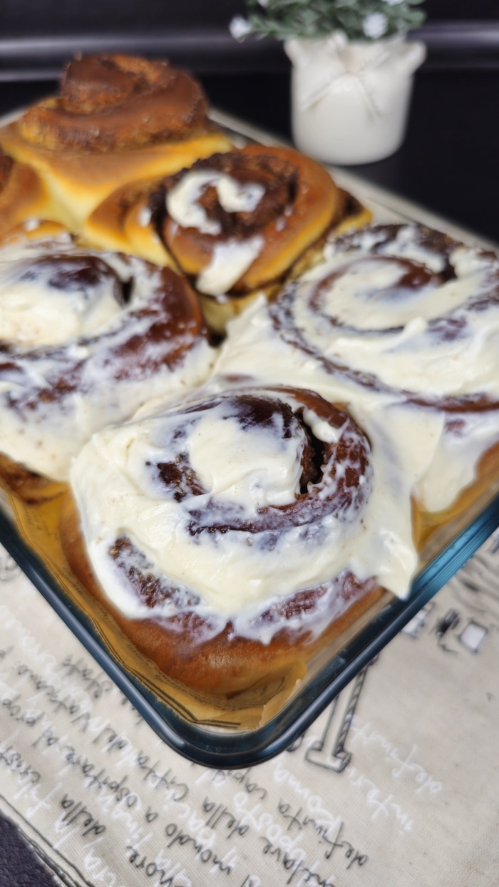 В теплое молоко добавим дрожжи и оставим на 5-10 мин., и после перемешиваем. Добавляем сахар, затем 1 чайную ложку соли, сливочное масло и 2 яйца, перемешиваем. Добавляем муку постепенно по одному стакану и вымешиваем (первые два стакана можно вымешивать миксером), в дальнейшем два стакана вымешиваем лопаточкой, далее выкладываем тесто из миски и вымешиваем руками. Готовое тесто убираем в миску (миску можно смазать растительным маслом) и даем отдохнуть 1 час. Через 1 час раскатайте тесто на большой прямоугольник (примерно 50 на 30 см., или чуть больше). Смазываем мягким сливочным маслом и посыпаем тростниковым сахаром, смешанным с корицей. Сворачиваем тесто в плотный рулетик и нарезаем рулетик примерно на 14-16 частей. Укладываем в форму, смазанную сливочным маслом, накрываем пленкой и убираем отдохнуть на 40 мин., а пока приготовим крем. Возьмем сливочно-творожный сыр, добавим сахарную пудру, взбить миксером, чтобы крем не был сильно густым, можно добавить молока для нужной вам консистенции. Через 40 мин. отправляем булочки в разогретую духовку 180° на 25-30 мин., до золотистого цвета и румяна. Готовые теплые булочки смазываем кремом (если вам будет мало крема можно сделать двойную порцию). Приятного аппетита!)