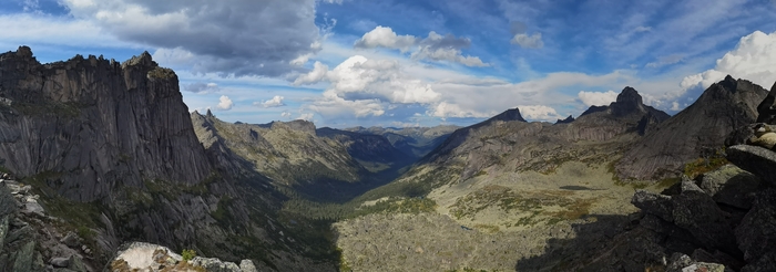 Виды с перевала открывались шикарные и скрашивали наши частые остановки. Но нас подгоняли сгущающиеся, тяжелеющие тучи. Смотря сверху, озёра Художников и Гармония, "сад камней" выглядели очень маленькими.