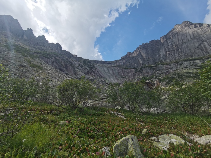 Мы решили сделать привал в этом живописном месте перед тяжёлым подъемом. Перед нами возвышались отвесные высокие скалы, пугая крутизной своих склонов. Нам ещё во второй день говорили о том, что на перевале Художников лучше идти через так называемое "игольное ушко", мол там легче. Этого плана мы и собирались придерживаться.
