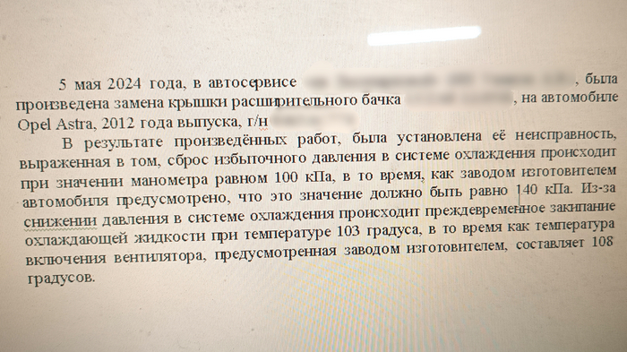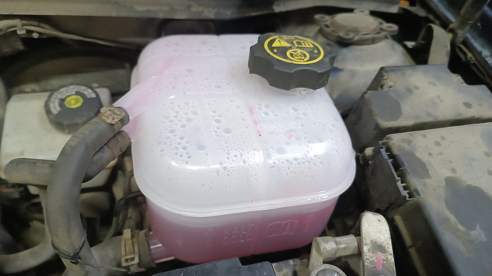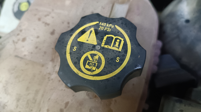 Поставил я значит новый бачок с крышкой, залил антифриз и начал прогревать двигатель для проверки. На температуре 103 градуса антифриз закипел. Проверка показала, что новая крышка от известного производителя запчастей на букву "Л" держит только 100 с копейками кПа вместо положенных 140.