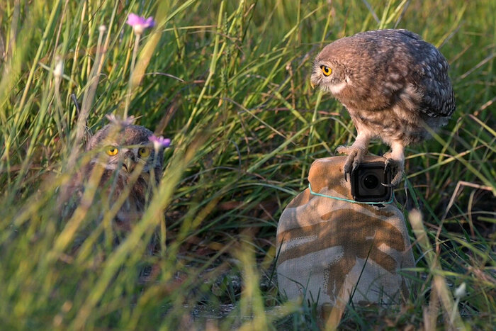 Судя по полученным результатам, мы как бы догадывались об участи камеры, но вот как бы снять и показать сам процесс взаимоотношений сычей с экшн-камерой со стороны.