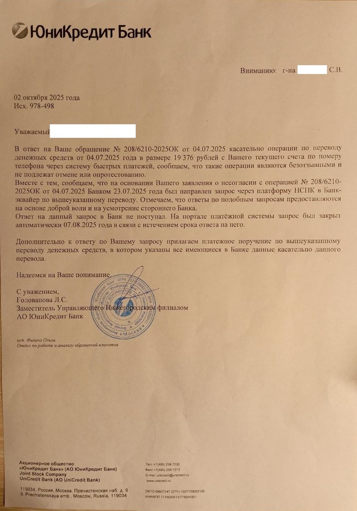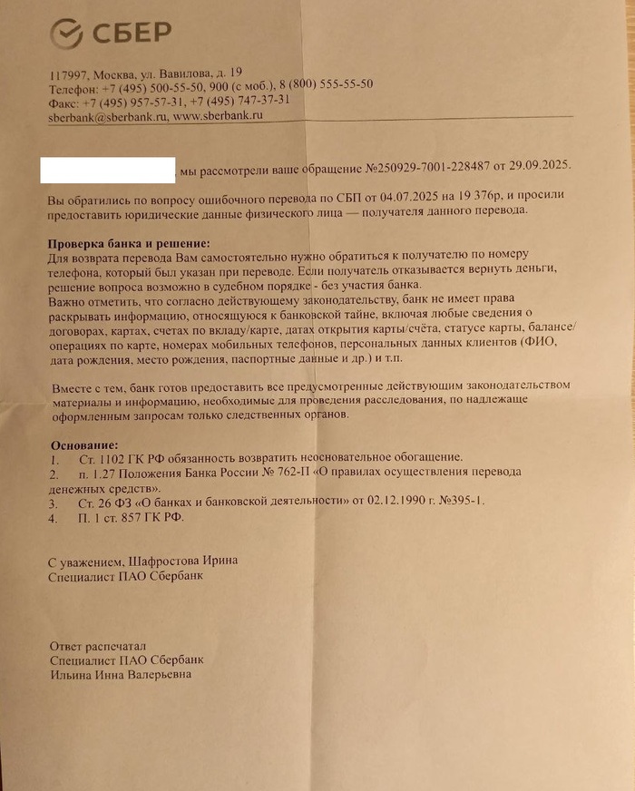 Короче. Сашка нас любитель хлопать ушами - и летом этого года в рабочее время умудрился запулить ВСЮ свою полумесячнуюзарплату в размере девятнадцати с хвостью тыров из ЮниКредит Банка на карту левой бабцы в Сбере , по тому же самому СБП. Номер в итоге отличался только на одну цифру: вместо 18 человек написал 15.