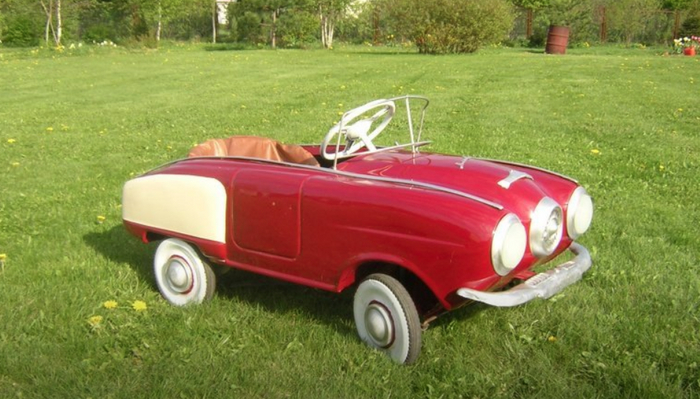 Купить в убитом состоянии и восстановить для детей педальный Москвич шестидесятых годов.