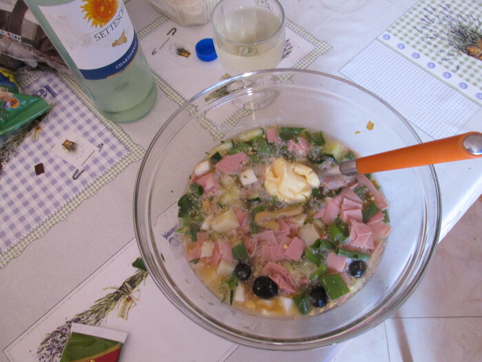 Готовили сами. И квас делали. Из закваски. Вот мой вариант сицилианской окрошки. Вместо огурцов - оливки.