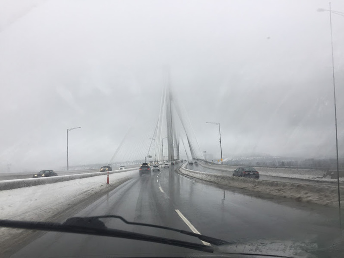 На фотографиях видно, что погода была довольно мерзкой. С неба шел снегодождь, на дороге была каша коричневого цвета. Добравшись до места назначения мы пошли смотреть, как нам попасть на мост. Мост называется Висячий мост Капилано. Находится он в заповеднике севернее Ванкувера, и выглядит вот так: