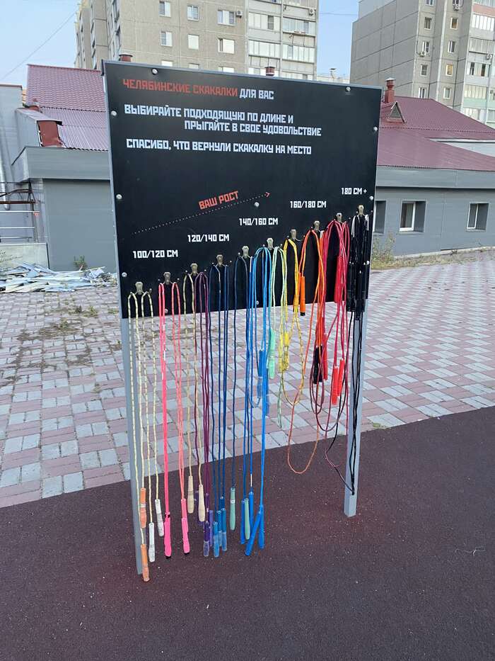 Два года назад мы установили стенды со скакалками в Челябинске. Они находятся в свободном доступе, любой желающий может взять скакалку и попрыгать.