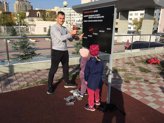 История со стендами получила широкую огласку, нашу инициативу увидели много людей, в том числе и те, кто принимает решения по благоустройству. После нашего поста на Пикабу нам поступил заказ на изготовление стенда для новой спортивной площадки в Казани – это был наш первый коммерческий опыт. Мы делали всё, кроме дизайна таблички, её заказчик сделал самостоятельно. Вот, что получилось.