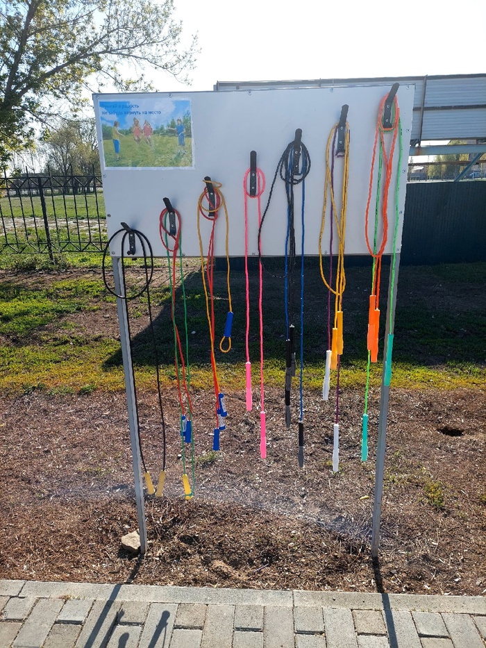 Однако, на данный момент мне известно об одном стенде, который в селе Оренбургской области установила одна активная семья, вдохновившись нашим примером. Сначала у них висели обычные резиновые скакалки, а когда я узнал, о них, то решил поддержать их инициативу и отправил им несколько десятков наших бисерных скакалок, которые лучше подходят для использования на улице в любую погоду.