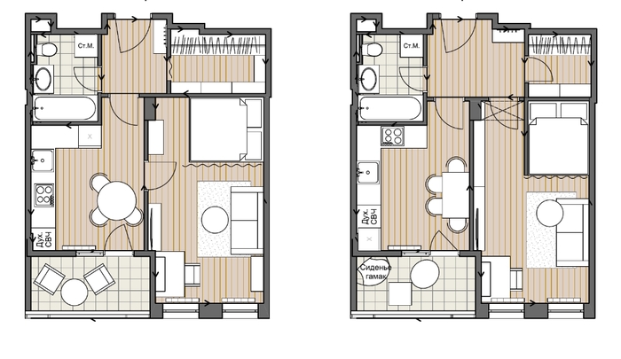 Получили 2 рабочих варианта. Плюс первого большая гардеробная. Второго - изолированные комнаты.