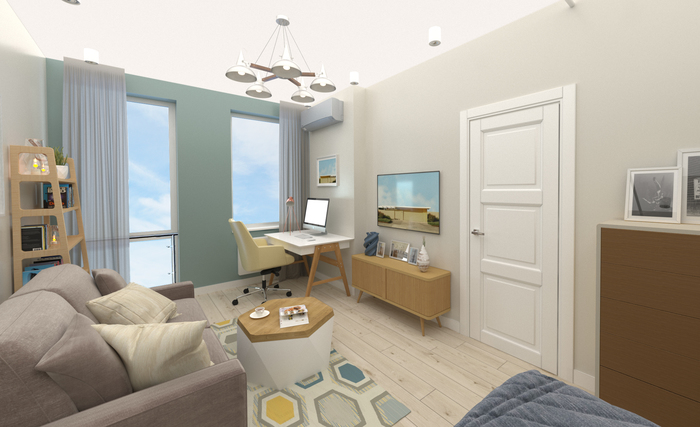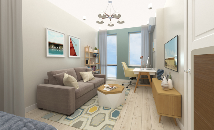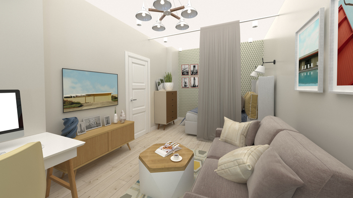 И начали думать. Сразу скажу, что я категорический сторонник полноценных кроватей для постоянного сна. Лечить спину потом дороже. Так же нужно было уместить небольшой диванчик для гостей, письменный стол, достоточно мест для хранения, полноценная кухня.