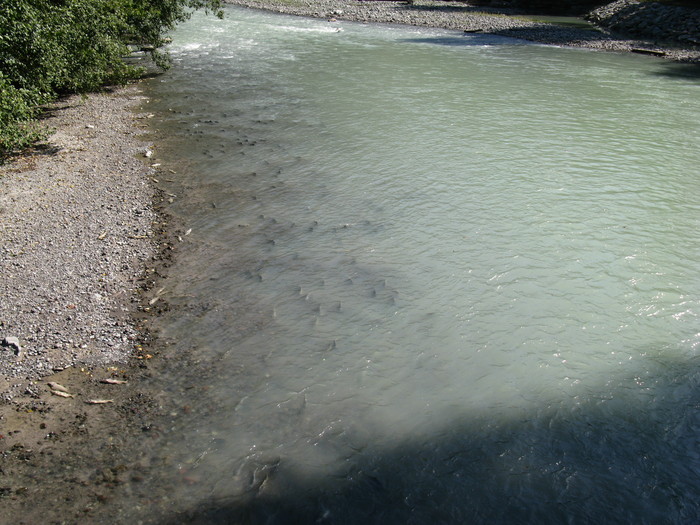 Быстрое течение и большой опыт позволили каякеру уйти от медведя. К плывшим за ним людям животное интереса не проявило.