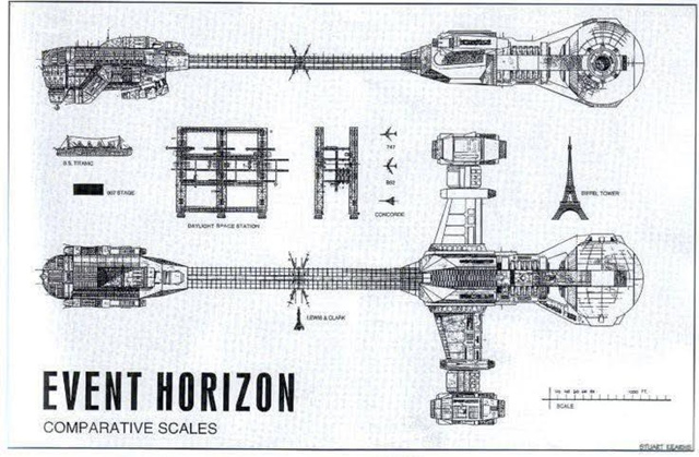 А вот «Event Horizon» — он другой. Огромнейший летающий крест, космический меч крестоносцев, монументальный и величественный, вызывающий трепет. Он максимально далёк от обычного, привычного образа космического корабля. Он похож на древний готический собор в космосе, недаром именно это сравнение появляется чуть ли не чаще, чем любое другое. Например, художник Кристиан Уорд, автор дополнительной серии комиксов по миру «Сквозь горизонт», так вспоминал о своём просмотре фильма: «Это было не похоже ни на что, что я когда-либо видел... По тону это было почти средневековье. Это было похоже на храм ужаса в космосе». Он был впечатлён настолько, что решил создать своё авторское видение этой истории спустя два десятилетия, получив одобрение от Филипа Эйснера, первого сценариста фильма.