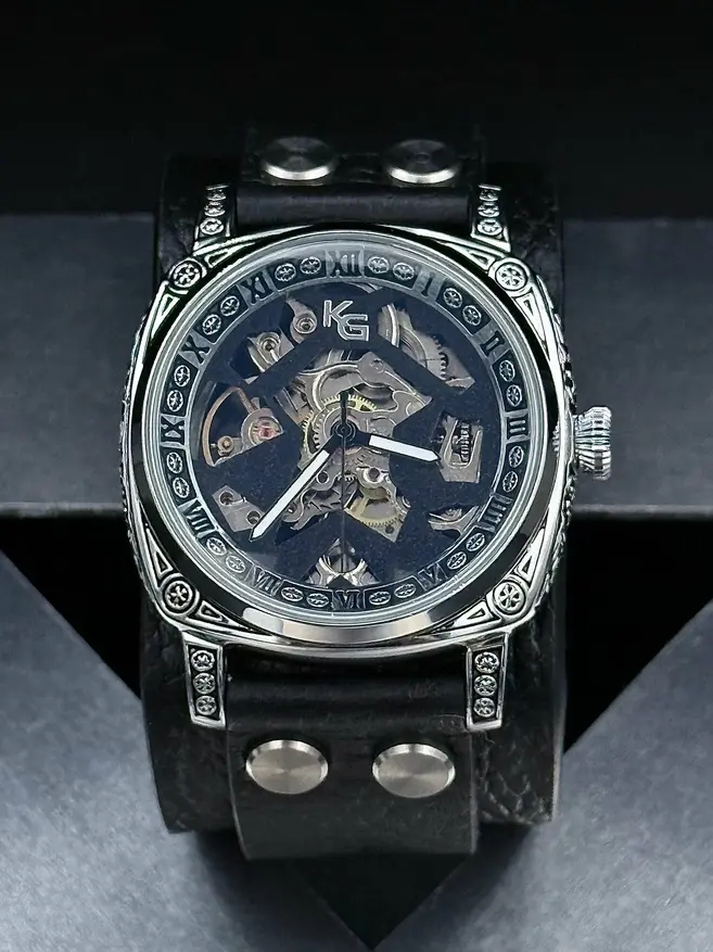 Ремешок сделан из телячьей кожи шириной 40 мм, окрашен в чёрный цвет. Циферблат частично открыт, видны элементы пружинного механизма. Водозащита — 3 ATM, что позволяет не бояться брызг и дождя. Механизм работает тихо, без лишних звуков.