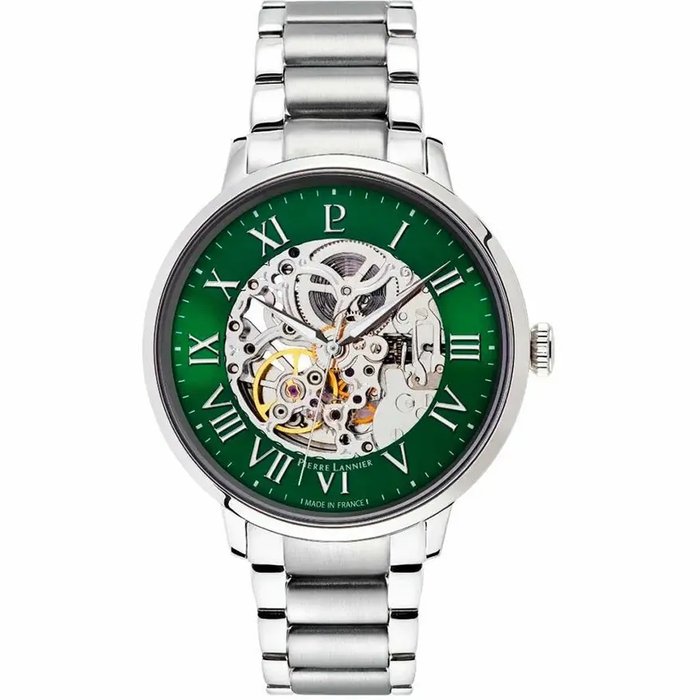 Корпус диаметром 43 мм изготовлен из нержавеющей стали. Внутри — механический механизм с автоматическим подзаводом.