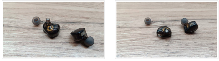 А теперь о самих наушниках. Заявлено, что корпус выполнен полупрозрачного пластика и алюминиевого сплава с обработкой. Форма корпуса имеет эргономичную форму, которая с легкостью умещается в ушном канале и не мешает при прослушивании. Наушники почти полностью размещаются в ушах, не торчат и не вываливаются при правильно подобранных амбушюрах.
