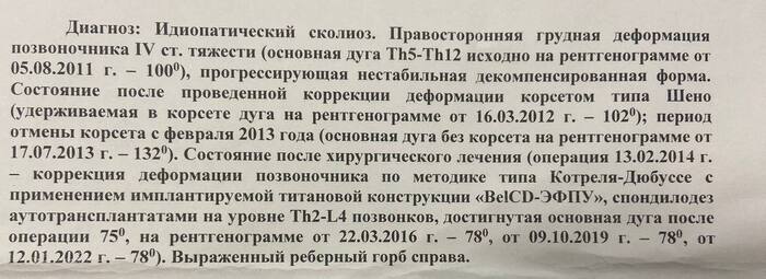 А сколиоз всё также прогрессировал, я кривилась всё больше и к 2011 году у меня уже было искривление 100 градусов... Начались боли в спине, отдышка, я не набирала вес.