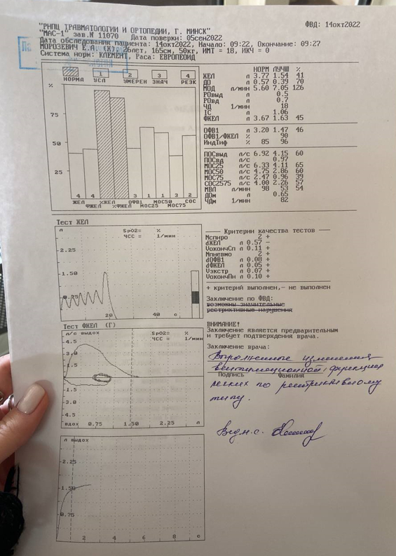 Следующая сдача спирографии и последующая госпитализация назначена на февраль 2023 года. До этого момента мне необходимо выполнять дыхательную гимнастику и вырабатывать выносливость легких.