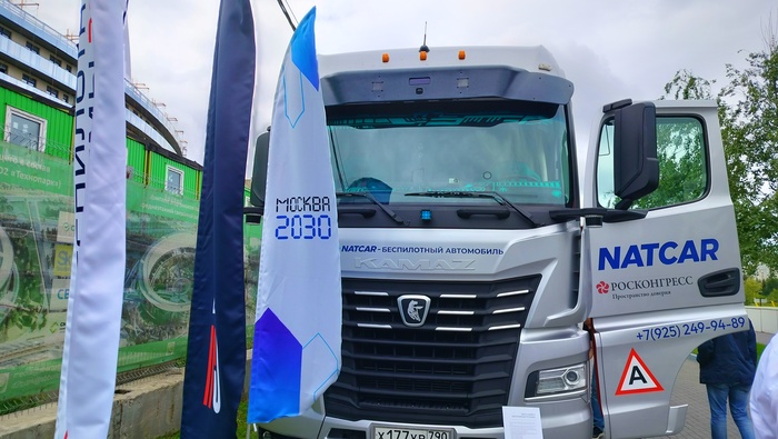 На улице у входа стоит беспилотные грузовик от Камаза. Правда, пока это так называемое третье поколение, где обязательно должен находится человек.